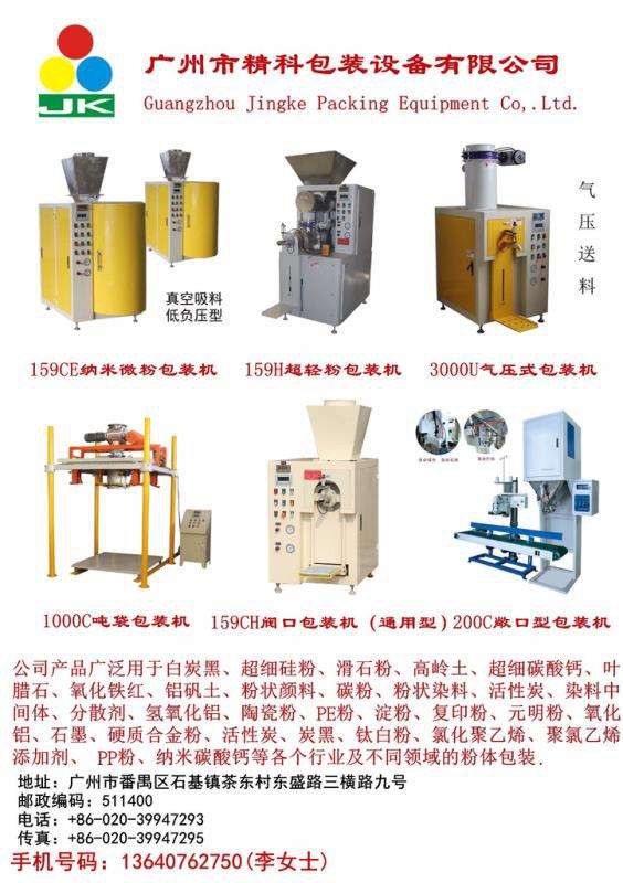 廣州市精科包裝設備有限公司主要生產:石英砂包裝機、顆粒包裝機、干粉砂漿包裝機;粉末包裝機、碳酸鈣包裝機、石英粉包裝機、淀粉包裝機、硬脂酸鋅鈣鎂包裝機、輕質納米炭酸鈣包裝機、硬脂酸鹽包裝機、改性活化粉包裝機、硬脂酸鋅包裝機、穩定劑包裝機、臘粉包裝機、色粉包裝機、氫氧化鎂鋁包裝機、橡膠粉包裝機、化肥包裝機、種子包裝機、糧食包裝機、白糖包裝機、飼料包裝機、硅酸鋯包裝機、沉淀炭黑包裝機、真空包裝機、 白炭黑包裝機、石墨包裝機、滑石粉包裝機、抗結劑包裝機、膩子粉包裝機和行業粉顆包裝設備、混合設備、輸送設備、除塵設備、稱重控制器、配料控制器。聯系人:吳惜蓮  聯系電話:13640762750,020-39947293,歡迎新老客戶咨詢洽談!