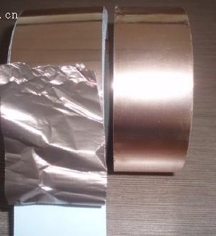 銅箔膠帶,鋁箔膠帶:根據需要背亞克力膠或導電膠,稱為導電銅箔膠帶,導電鋁箔膠帶,背亞克力膠也稱為單導銅箔,自粘銅箔,單導鋁箔,自粘鋁箔。而背導電膠后由于雙面導電,故也稱作雙面導電銅箔膠帶簡稱雙導銅箔,雙面導電鋁箔膠帶簡稱雙導鋁箔。銅鋁箔膠帶其基材一般為純銅箔,純鋁箔,銅箔選用高質量的紫銅箔,主要規格按銅箔基材有.0.025,0.035,0.05, 0.075., 0.10mm,背膠層厚度為0.035-0.040mm,單面背導電膠或絕緣膠,鋁箔主要規格按鋁箔基材厚度有0.010, 0.025,0.030,0.050,0.075, 0.10mm等,單面背導電膠或絕緣膠。