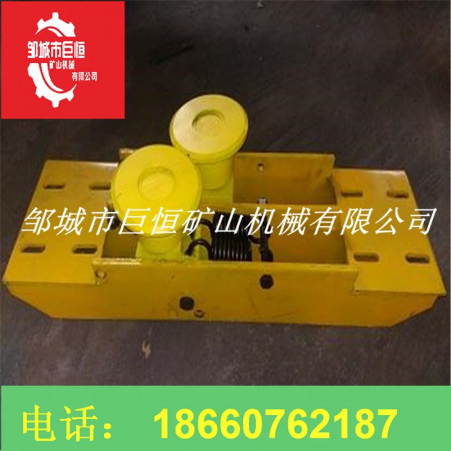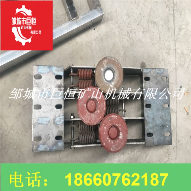 壓繩輪組用壓板固定在軌道的下沿上。一般在下列地點(diǎn)考慮安裝壓繩輪: ①在水平彎道的前后,當(dāng)彎道處的位臵較低時(shí)。②在巷道的下凹變坡點(diǎn),當(dāng)變坡角較大時(shí),主壓繩輪組應(yīng)保證安裝數(shù)量,否則易發(fā)生跳繩現(xiàn)象。③當(dāng)鋼絲繩偏離軌道中心較多時(shí)。平托輪組用壓板固定在鋼軌的下沿上。在平道或坡道上每隔一定的間距安裝托繩輪組,在軌道的上凸處即坡頂前后間距要縮小。