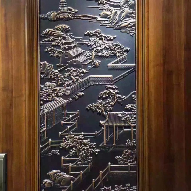 日常生活中不是缺少美,而是缺少創(chuàng)造力的美,只要有創(chuàng)新,很枯燥無趣的一樣東西也可以打造得生命力十足。純銅純鋁雕刻屏風背景墻,銅浮雕壁畫的設計,雕刻線條的點綴,讓原本單調(diào)的壁畫多了一份典雅和魅力。