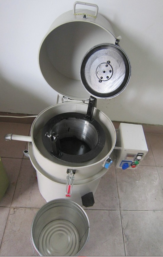 脫油機工作時,利用離心率把油拋向外壁的四周及上方的頂部,這兩部分是收集油的部分,另外,在脫油機的內壁有數十個豎直的槽,統一的排列,可以使液體流暢地流動,特別遇到細小的東西的時候,金屬絲的內壁殘留物,外部形成一個真空空間,把油充分脫凈。