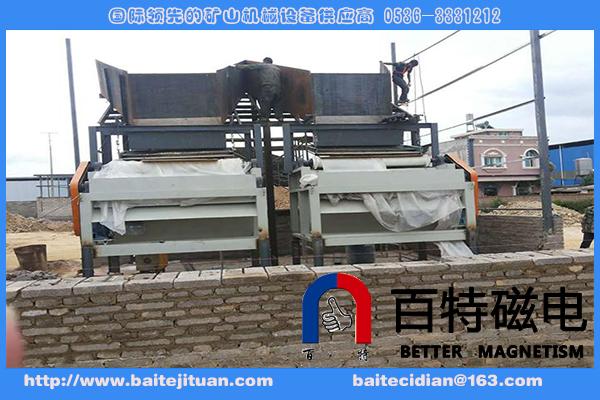 含有鐵磁性物質的物料由受料斗經過電磁振動給料機均勻的下到第一條輸送皮帶上,當物料通過一選強磁輥時,鐵磁性物質由于受磁力的吸附作用被吸附到強磁輥上,隨著皮帶的轉動使其脫離磁場并下落到收集斗中。其它物料和沒有選凈的鐵磁性物質隨溜槽進入下一級磁選皮帶完成選別,原理同上。最后選出符合要求的合格產品。