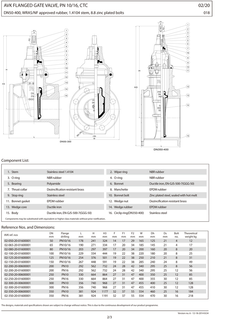 閥體和閥帽:球墨鑄鐵,GGG-50,符合DIN 1693(B S 2789 grade 500-7)