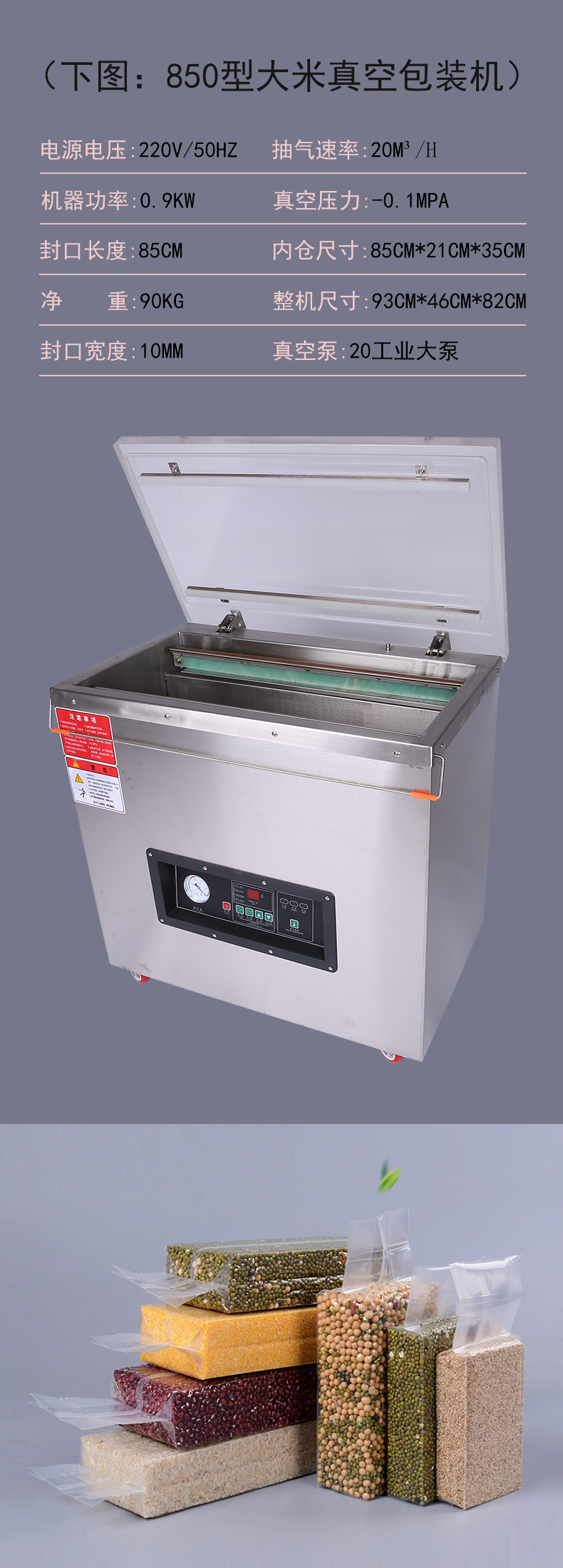 大米米磚真空包裝機 武漢大米米磚真空包裝機是加深型直空包裝機,自帶有多種不同大小的米磚模具,直空句裝后可以延長產品的保質期,起到耐氧化、防蟲蛀、霉變、防受潮等功能,是一款專為直空包裝大米米磚的機型產品。該直空包裝機是中小型大米生產廠家直空包裝的*機型。
